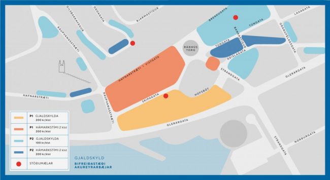 - Bifreiðastæðasjóður: 100-200 kr. á klst. auk þjónustugjalda ef greitt er með smáforriti