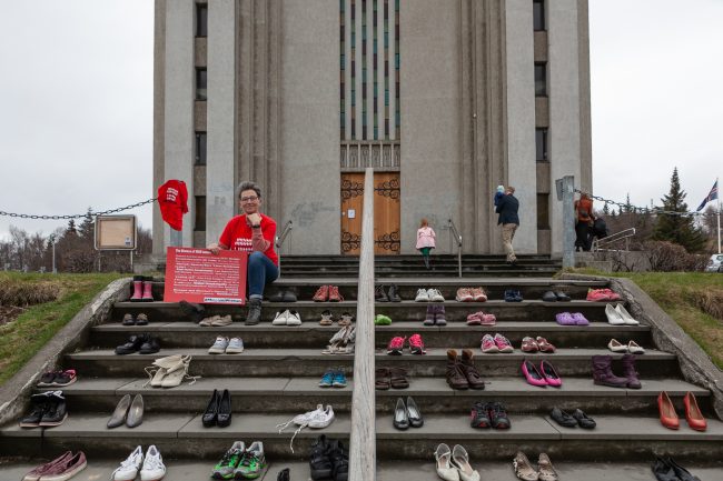 Herdís Sigurjónsdóttir, ásamt dyggum aðstoðarmönnum, söfnuðu rúmlega 465 skópörum og röðuðu þeim í kirkjutröppurnar á Akureyri til að vekja athygli á Akureyrarveikinni.