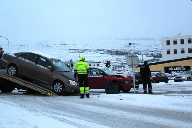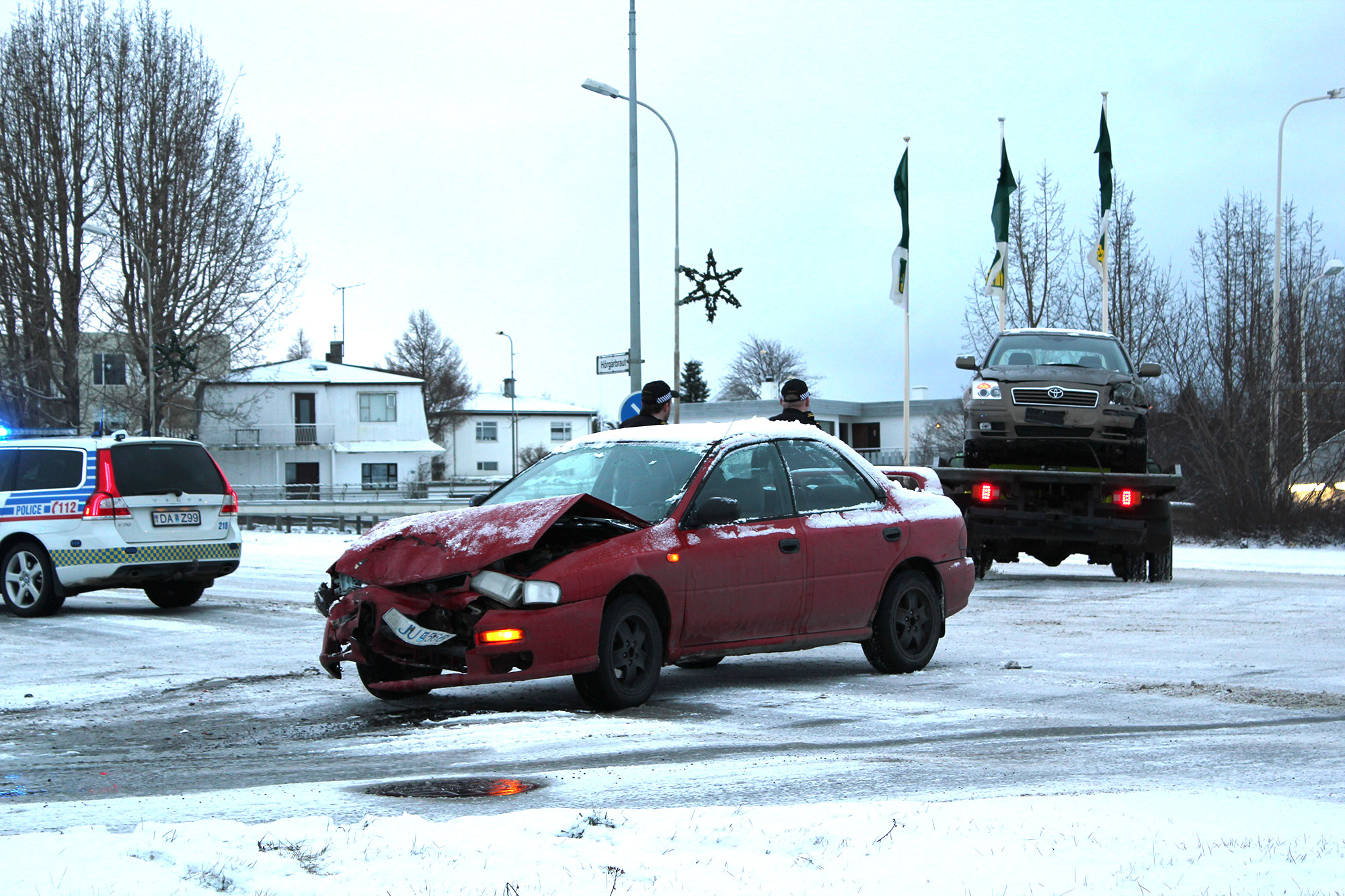 Draga þurfti báða bílana af vettvangi, en þeir voru óökufærir eftir áreksturinn.