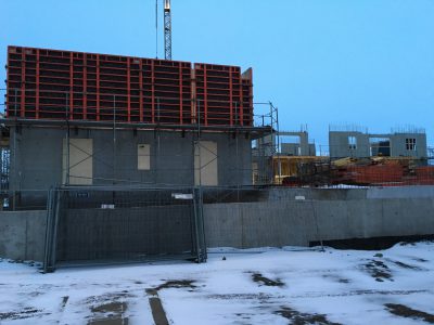 Þá eru framkvæmdir við Drottningarbrautarreit vel á veg komnar en eins og Akureyringum er kunnugt stendur til að byggja þrjú tveggja hæða íbúðarhús með risi, á svæðinu sem og hótel á horninu við Samkomuhúsið. Á myndunum má sjá að fyrstu tvö húsin eru langt komin, en þeir sem að verkinu standa eru að öllum líkindum á undan áætlun vegna frábærra veðurskilyrða í vetur, en t.a.m. var þetta einn hlýjasti desembermánuður á Íslandi í manna minnum.