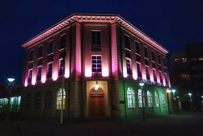 Myndir: Byggingar á Akureyri lýstar upp með bleiku ljósi