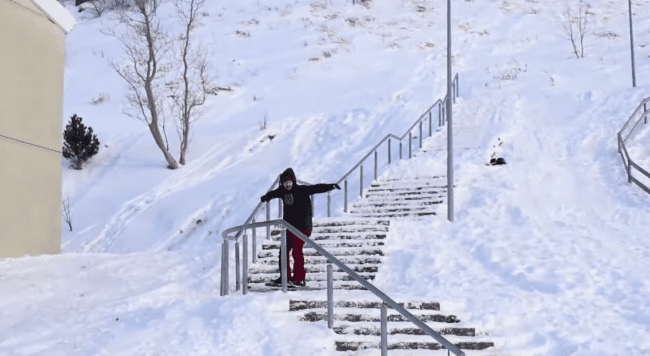 Í einu atriði í myndinni rennir hann sér, að því er virðist, áreynslulaust niður handrið á snjóbretti. Það er þó mun meiri vinna sem býr að baki en virðist vera þegar horft er á myndina. Eiki birti fyrr í vikunni myndband á YouTube þar sem má sjá að það tók hann 84 tilraunir niður handriðið til þess að ná því rétt.