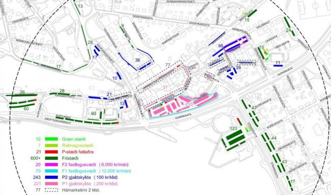 Gjald fyrir bílastæðakort íbúa verður 6.000 kr. á ári og gjald fyrir bílastæðakort á fastleigusvæðum verður 12.000 kr. á mánuði á gjaldsvæði 1 og 6.000 kr. á mánuði fyrir gjaldsvæði 2.
