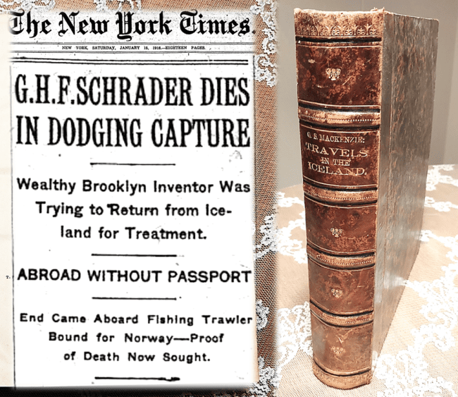 Bókin sem um ræðir heitir Travels in the Island of Iceland, during the Summer of the Year 1810. Hún er eftir Sir George Steuart Mackenzie, gefin út árið 1812 og ber stimpil Möðruvallaskóla. Þannig er hún líklega ein af þeim bókum sem skólapiltar björguðu úr brennandi skólabyggingunni árið 1902. Frá Möðruvöllum fór hún til Gagnfræðaskólans þar sem Schrader fékk hana að láni í upphafi dvalar sinnar á Akureyri.