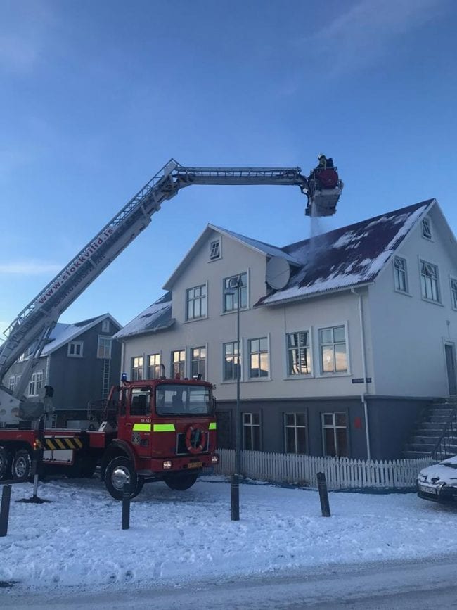 Enn er verið að vinna að niðurlögum eldsins sem hefur náð upp í þak hússins.