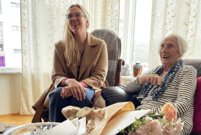 Afmælisveislan var haldin með pompi og prakt á sunnudaginn og þá kom meðal annars einn af nágrönnum Sólveigar færandi hendi með afmælisgjöf frá öðrum íbúum fjölbýlishússins. „En hann er nú svo ungur,“ segir Sólveig á vef Akueyrarbæjar. „Held að hann sé ekki nema 93ja ára.“