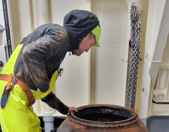Árni Rúnar Jóhannesson skipstjóri segir að Hreinn Birkisson stýrimaður hafi orðið var við að torkennilegur hlutur væri kominn í trollið og því ákveðið að hífa inn veiðarfærin.