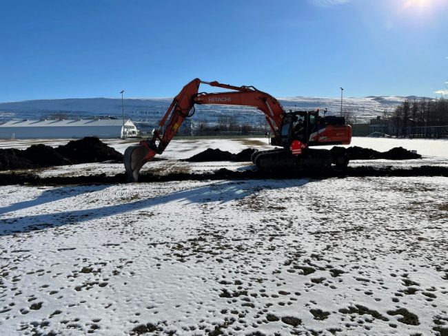 Fyrsta skrefið í framkvæmdum er jarðvegsvinna þangað sem færa á núverandi gervigras. Það verður einfaldlega dregið yfir og mun nýtast í svipaðri mynd og í dag, en þó verða engin flóðljós sett upp við það.