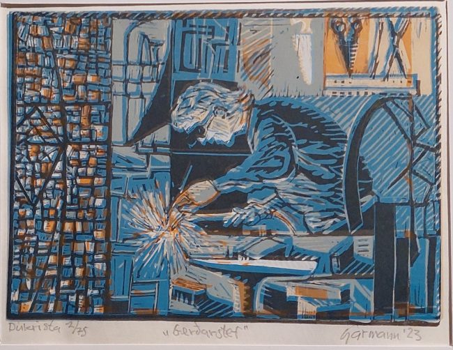 Grafíkmyndir eru unnar með því að rista eða æta mynd í grafíkplötu, sem getur verið málmplata, steinn, tré eða línóleum dúkur. Guðmundur notast við línóleum dúk og það fer eftir því hversu margir litir eru á kortinu hversu oft hann þrykkir.