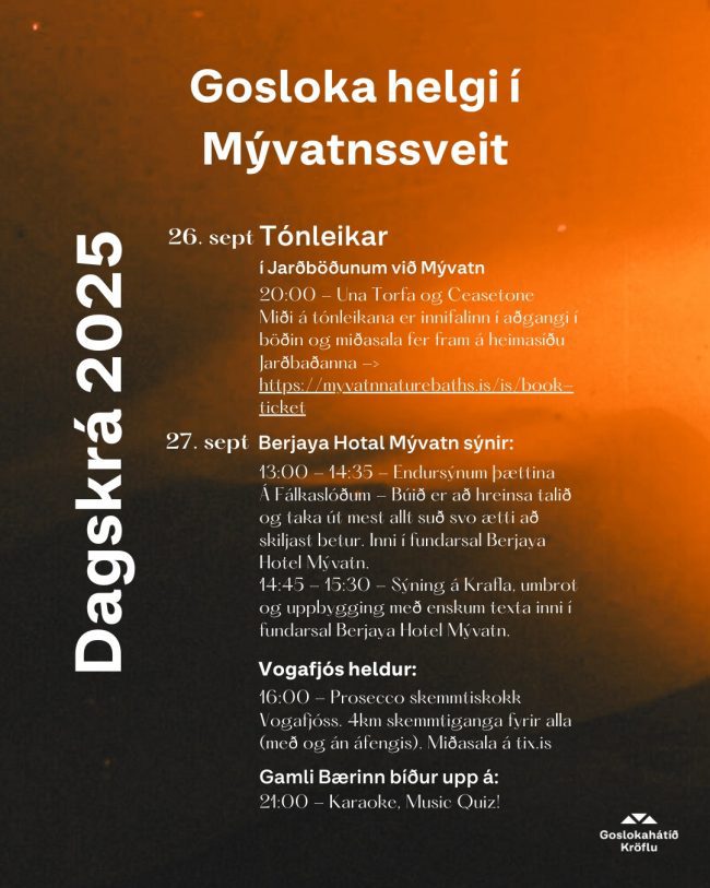 Þrátt fyrir styttri dagskrá er nóg um að vera á hátíðinni í ár. Hápunkturinn verður án efa tónleikar með Unu Torfa og Ceasetone í Jarðböðunum á laugardeginum. Dagskránna í heild sinni má sjá hér að neðan.