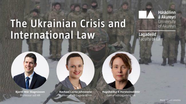 Í hádeginu á morgun, miðvikudag, fer fram rafrænt málþing á vegum Lagadeildar Háskólans á Akureyri. Fengist verður við að svara spurningunni: Hverjar eru grundvallarreglur þjóðaréttar um beitingu vopnavalds og hvernig má beita þeim í því ástandi, sem nú ríkir í Úkraínu?