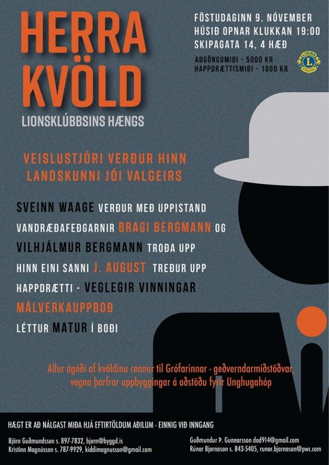 Lionsklúbburinn Hængur heldur Herrakvöld í dag, föstudaginn 9. nóvember, þar sem allir herramenn eru velkomnir til að mæta og eiga skemmtilega stund til styrktar góðs málefnis.