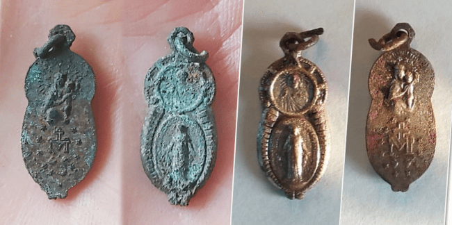 Hálsmenið er 2 x 1 cm að stærð, með útlínur sem minna á töluna átta og upphleyptum myndum og bókstöfum beggja megin. Tilviljun réði því að Varðveislumenn komu auga á menið í blautri moldinni. Grænn litur koparsins, sem tilkominn er vegna veðrunar, kom þeim á sporið. Erfitt reyndist að greina tákn eða merkingar en þó lék strax grunur á að þarna væri annað hvort um hluta af rennilás að ræða eða hálsmen. Úrskurður fékkst þegar heim var komið og litli kopargripurinn var hreinsaður. Undan skítnum birtust María mey og Jesús Kristur í öllu sínu veldi.