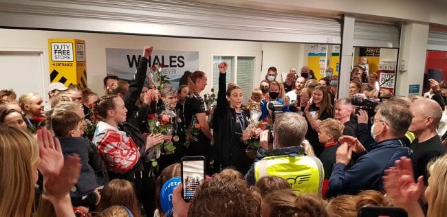 Fjöldi fólks tók á móti hetjunum á Akureyrarflugvelli og þá tók flugvallarþjónustan vel á móti Íslandsmeisturunum eins og sjá má á myndbandi sem birtist á Facebook síðu Akureyrarflugvallar hér.