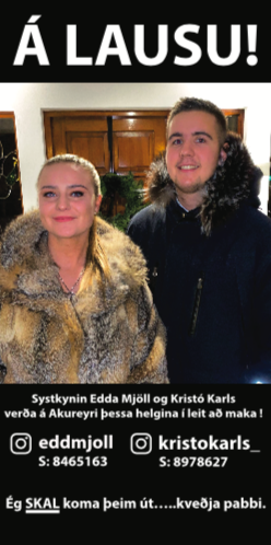 „Á LAUSU! Systkinin Edda Mjöll og Kristó Karls verða á Akureyri þessa helgina í leit að maka! Ég SKAL koma þeim út… kveðja pabbi,“ segir á auglýsingunum.