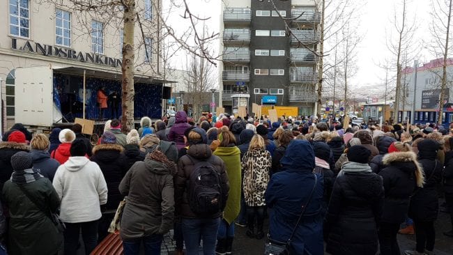 Konur allsstaðar á landinu lögðu niður störf kl. 14.55 í dag til að mótmæla launamismun kynjanna. Samkvæmt nýjustu tölum Hagstofu Íslands um launamun kynjanna eru meðalatvinnutekjur kvenna 74% af meðalatvinnutekjum karla. Konur eru því með 26% lægri atvinnutekjur að meðaltali. Samkvæmt því hafa konur unnið fyrir launum sínum eftir 5 klukkustundir og 55 mínútur miðað við fullan vinnudag frá kl. 9–17. Daglegum vinnuskyldum kvenna er því lokið kl. 14:55.