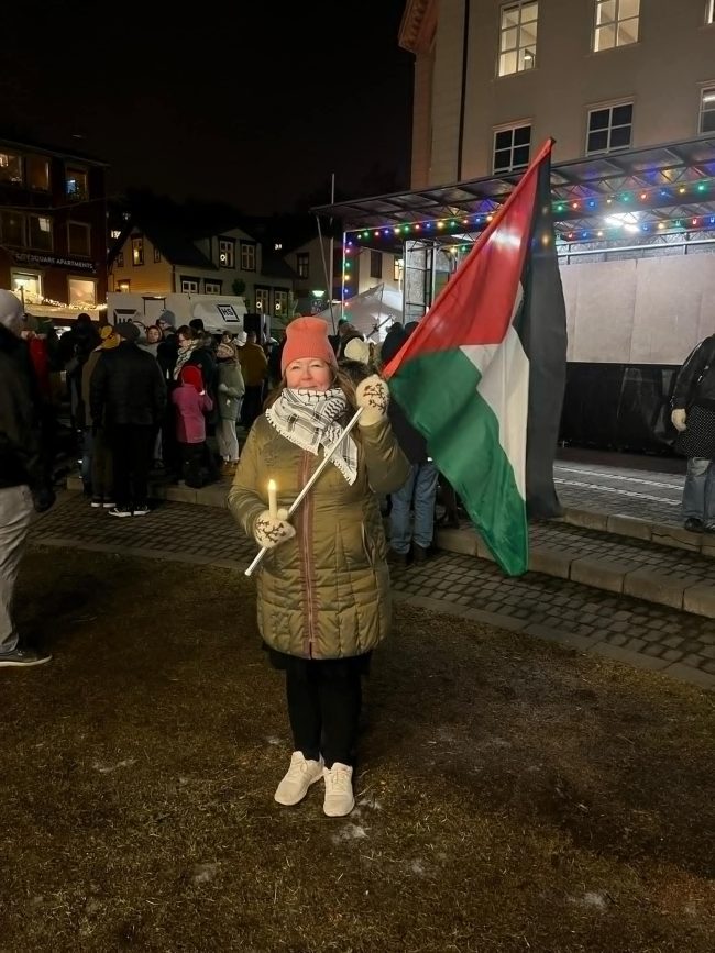 Einnig hvetur hún fólk til þess að samþykkja eins og eina vinabeiðni á Facebook frá Gaza. Upplagt sé að gerast vinafjölskylda fjölskyldu þar, hún bjóðist til að milliganga það. Allra mikilvægast sé að öll reyni að gera eitthvað til stuðnings og til að mótmæla þjóðarmorðinu, allt sé betra en að líta undan, það sé ekki í boði.