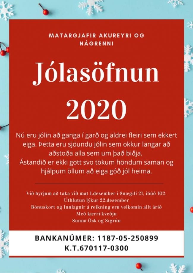 Ástandið er sérstaklega erfitt í ár hjá mörgum svo við bendum á að söfnun er enn í fullum gangi hjá þessu verðuga málefni. Matargjafir, bónuskort, upphæðir – Öll framlög eru velkomin.