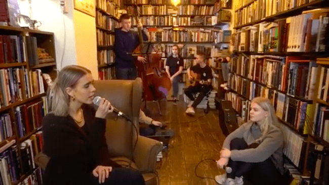 Efnilegt tónlistarfólk úr Leikfélagi Menntaskólans á Akureyri flutti lagið Neðanjarðar eftir 200.000 Naglbíta í Fróða Fornbókabúð til þess að auglýsa söngleikinn Hjartagull.