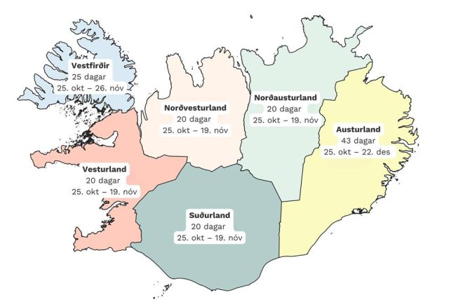 Í fjórum landshlutum (Norðausturlandi, Norðvesturlandi, Vesturlandi og Suðurlandi) er tímabilið jafn langt, eða 20 veiðidagar. Á Vestfjörðum eru veiðidagarnir 25 og lengst er tímabilið á Austurlandi, en þar spannar tímabilið 43 veiðidaga þetta árið.