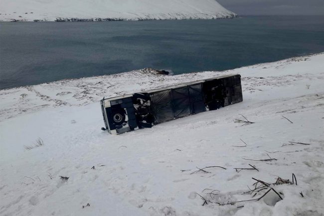 „Laust fyrir klukkan 14:30 var tilkynnt um að rúta hefði farið út af og oltið á hliðina á Ólafsfjarðarvegi skammt frá Múlagöngum, Ólafsfjarðar megin. 25 farþegar voru í rútunni auk ökumanns og fararstjóra. Engin alvarleg slys urðu á fólki.