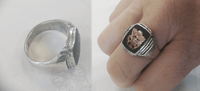Innan í hringnum er grafið lógó fyrirtækisins AMICO (American Insignia Company), örn með vængina úti ofan á stöpli og skeifulaga borði undir stöplinum. Amico var með höfuðstöðvar í New York og var í rekstri 1919-1982. Á stríðsárunum framleiddi fyrirtækið skartgripi, orður og barmmerki fyrir bandaríska herinn. Logo fyrirtækisins breyttist í upphafi stríðsins sem gerir gripi með þessu tiltekna logoi fágæta. Líklegt er því að hringurinn sem fannst á Akureyri um helgina sé ekki yngri en frá árinu 1942. Undir stöplinum er grafið orðið Sterling til marks um að hringurinn sé gerður úr 92,5% hreinu silfri.