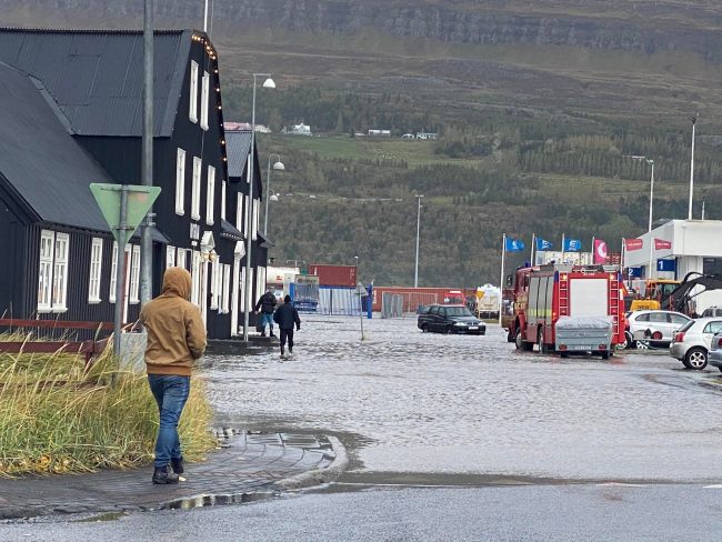 Vatn hefur tekið að flæða inn í hús á svæðinu og hefur meðal annars flætt inn í Braggaparkið sem stendur við Laufásgötu.