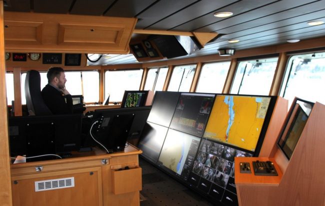 Brúin í uppsjávarskipi Samherja, Margréti EA 710 hefur tekið miklum breytingum á skömmum tíma. Svokölluð skjáveggjastýring hefur verið innleidd, sem gerir það að verkum að skipstjórinn getur stjórnað og fylgst með hvaða tæki sem er á stórum sjónvarpsskjáum. Hjörtur Valsson skipstjóri segir að ótrúlega vel hafi gengið að setja upp skjáveggjastýringuna.