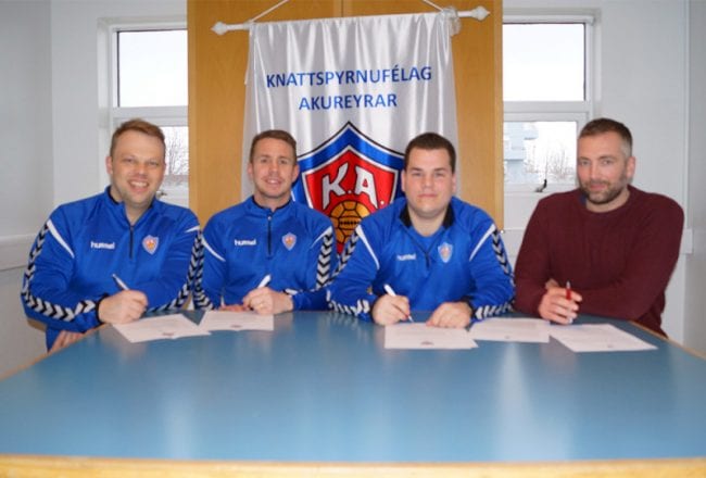 Stefán Árnason og Jónatan Magnússon munu þjálfa karlalið KA í handbolta áfram næstu tvö árin. Þeir félagar skrifuðu undir tveggja ára samning við handknattleiksdeild KA í gær.
