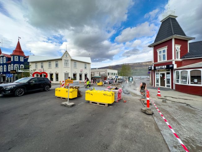 „Lokið er við að helluleggja götuna við suðurhluta torgsins og gekk sú framkvæmd vonum framar. Nú er sérstakt fúguefni á milli hellusteina á því svæði að harðna almennilega en líklega verður óhætt að hleypa bílaumferð suður Hafnarstrætið frá gatnamótunum eftir helgi. Næsti áfangi er að lagfæra gönguleiðir yfir Listagilið og einnig gangstéttar og gönguleiðir að norðanverðu sem sjá má innan rauðu reitanna á myndinni að neðan,“ segir á vef bæjarins.