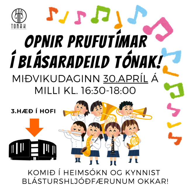 Miðvikudaginn 30. apríl verður mikið um að vera í blásaradeild Tónlistarskólans á Akureyri. Um morguninn bjóða yngri blásarasveitirnar nemendum úr hinum ýmsum grunnskólum í heimsókn í Hof að hlusta á hressa og skemmtilega tónleika. Síðar um daginn, milli klukkan 16:30-18:00 býður blásaradeild skólans upp á opna prufutíma fyrir alla sem vilja. Þar verður hægt að kynnast hljóðfærum- og kennurum blásaradeildarinnar.