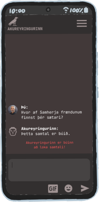 Prýðilegt app sem innfæddir geta nýtt sér til þess að spyrja vélmennið nytsamlegra spurninga en vélmennið getur spjallað um kók í gleri, snjómokstur og rigningu á suðurlandinu en ef að minnst er á Samherja við vélmennið lokast appið og eyðir sér sjálft úr snjalltæki notandans.