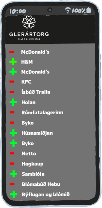Appið er einfalt í notkun en það gefur þér tilkynningar í símann þegar nýjar búðir opna á Glerártorgi. Sömuleiðis fær notandi tilkynningar þegar búðum er lokað.