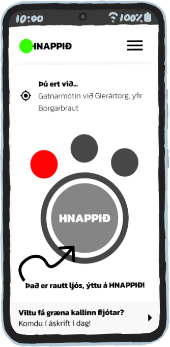 Þarftu að komast í flýti yfir gangbraut? Af hverju ekki að nota app til þess að skipta úr rauðum karli yfir í grænan á fljótlegan og auðveldan máta. Óþarfi er að snerta skítugan kaldan hnapp til þess að komast leiðar sinnar, notum Hnappið. Áskriftaleiðir eru einnig í boði, 1200kr á mánuði til þess að fá græna karlinn fyrr eða á um 4 sekúndum.