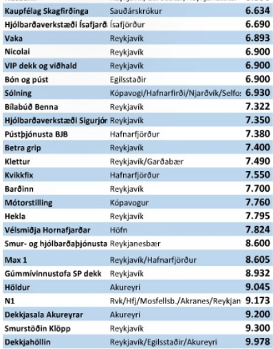 Öll hjólbarðaverkstæði á Akureyri voru staðsett efst á listanum meðan að flest verkstæði á höfuðborgarsvæðinu og eitt á Ísafirði voru neðst. Höldur var með ódýrasta verðið á Akureyri en þar kostar umfelgun 9.045 kr. Dekkjasala Akureyrar fylgir þar fast á eftir með umfelgun á 9.200 kr.