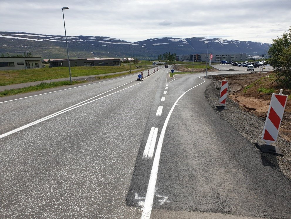 „Í tengslum við þessa breytingu var ráðist í ýmsar framkvæmdir innan og utan lóðar Bónuss. Graseyja hefur verið útbúin til þess að aðgreina inn- og útkeyrslu frá bílastæði og um leið var Miðhúsabrautin breikkuð lítillega á kaflanum niður að hringtorgi. Miðeyjunni er ætlað að koma í veg fyrir U-beygjur og beina umferð niður á hringtorg þar sem er auðvelt að snúa við ef þörf krefur. Eins hefur nokkrum bílastæðum verið bætt við á norðurhliðinni,“ segir í tilkynningu Akureyrarbæjar.