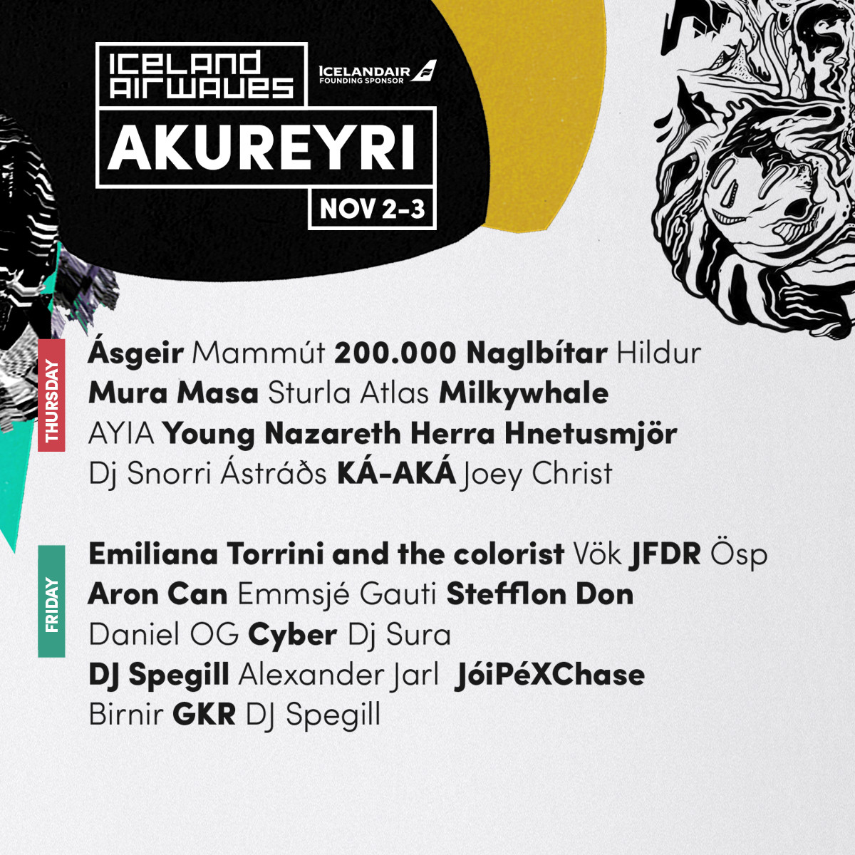 Á föstudag heldur veislan svo áfram. Í Hofi spilar Ösp klukkan 20:00, JFDR klukkan 21:00 og Vök klukkan 22:00. Eitt stærsta atriði hátíðarinnar hefst svo klukkan 23:00 þegar Emiliana Torrini stígur á svið ásamt hljómsveitinni The Colorist frá Belgíu.