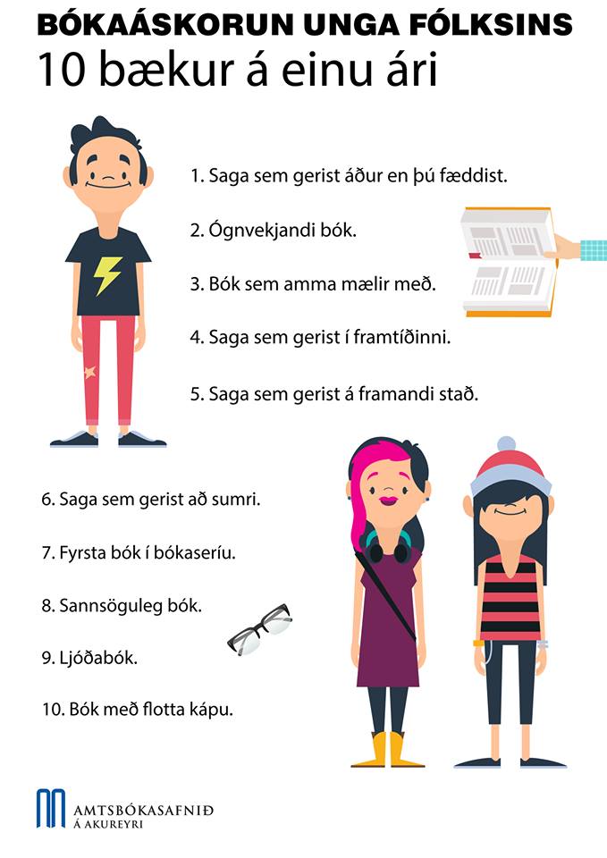 Bókaáskorun Amtsbókasafnsins hefur slegið í gegn á samfélagsmiðlum. Stofnaður hefur verið Facebook-hópurinn #26 bækur fyrir átakið. Í dag sendi bókasafnið frá sér aðra bókaáskorun sem er ætluð fyrir ungt fólk. Þar er skorað á unga fólkið að lesa 10 mismunandi bækur á árinu en áskorunina má sjá hér að neðan.
