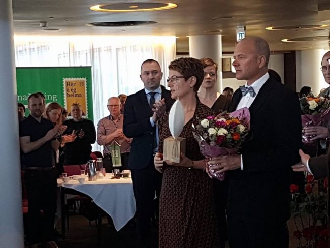 Ari Laxdal og Sigurlaug Sigurðardóttir með landbúnaðarverðlaunin. Myndin var tekin á athöfninni í morgun. Mynd: grenivik.is