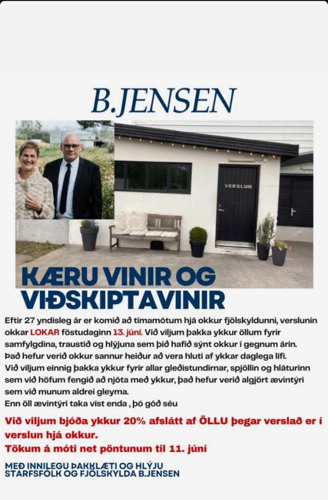 Í tilkynningu sem B. Jensen gaf út fyrr í dag á Facebook kemur fram að eftir 27 ára rekstur muni versluninni verða lokað frá og með 13. júní. Í boði verður 20% afsláttur af öllum vörum fram að lokun. Tilkynninguna má lesa hér fyrir neðan í heild sinni.