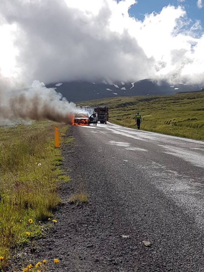 Lögreglu og slökkviliði á Akureyri var tilkynnt um eld í bifreið á Hlíðarfjallsvegi á milli 16 og 17 í dag. Bifreiðin var alelda þegar lögreglu og slökkvilið bar að garði fyrir skömmu og stendur slökkvistarf nú yfir þegar fréttin er skrifuð.