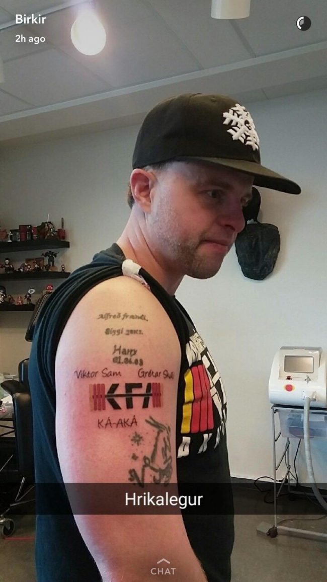 Birkir gerði sér lítið fyrir í morgun og húðflúraði listamannsnafn rapparans á upphandlegginn á sér. Einnig húðflúraði hann á sig nöfn Viktors Samúelssonar, Grétars Skúla Gunnarssonar og merki Kraftlyftingafélags Akureyrar.