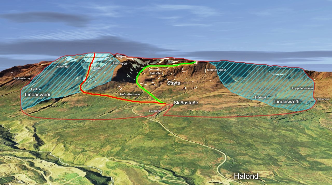 Á meðfylgjandi mynd má sjá merkt með rauðu leiðina sem vélsleðamenn óku yfir lindasvæðið. Sú leið sem á að fara er merkt með grænu.