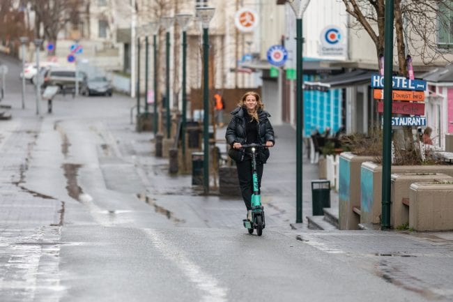 vægu gjaldi. Þegar ferðinni er lokið er hægt að leggja rafskútinni hvar sem er innan þjónustusvæðisins. Það mun sem sagt vera hægt að hoppa alla leið suður á Stórhöfða svo lengi sem að ferðin endi aftur inni á þjónustusvæðinu