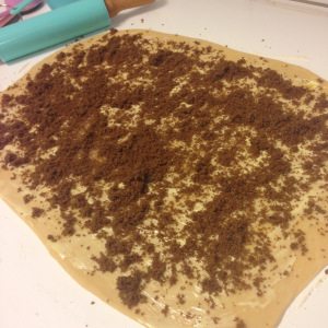 9. Blandið saman púðursykri og kanil og stráið svo yfir deigið sem að er þakið smjöri
