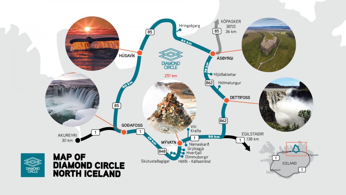 Á vef Markaðsstofu Norðurlands má nú finna ráðleggingar um hvernig er hægt að nýta tímann vel þegar ferðast er Demantshringinn. Lögð er áhersla á fimm lykilstaði á leiðinni; Goðafoss, Mývatn, Dettifoss, Ásbyrgi og Húsavík.