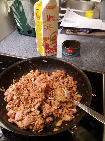 Hakkið er brúnað á pönnu og kryddað eftir smekk. Túnfisknum bætt við ásamt próteini og osti. Að endingu kemur svo rjómi og allt látið malla á pönnu í nokkrar mínútur, eða þar til osturinn bráðnar.