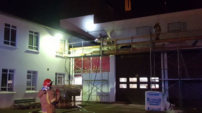 Slökkviliðinu tókst að ráða niðurlögum eldsins á skömmum tíma en slökkviliðsmenn segja líklegt að framkvæmdir við þakið sé ástæða þess að eldurinn kviknaði.