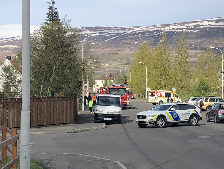 Tveir lögreglubílar lokuðu umferð um götuna og þá komu einnig tveir sjúkrabílar á staðinn auk slökkvibíls.