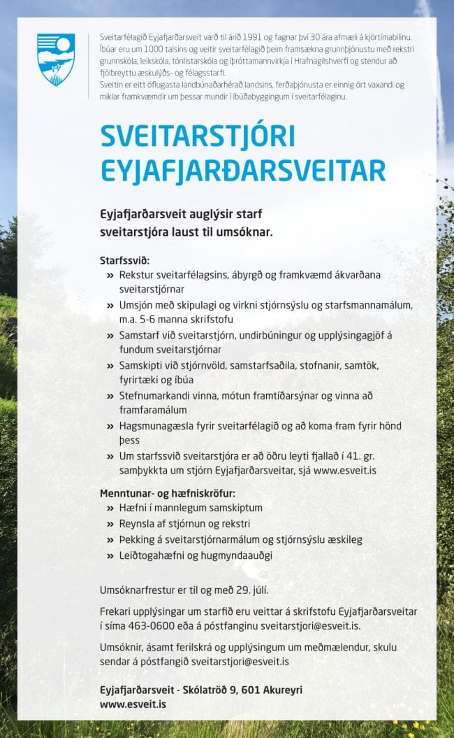 Starf sveitarstjóra Eyjafjarðarsveitar er laust til umsóknar, en þetta kemur fram í auglýsingu á heimasíðu sveitarfélagsins. Umsóknarfrestur er til og með 29. júlí.